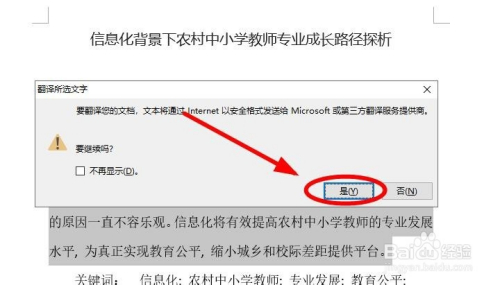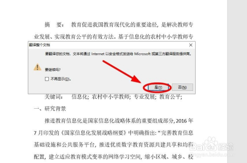 在弹出的“翻译整个文档”对话框要求要把整个文档发送给Microsoft或者第三方,我们单击“是”就好