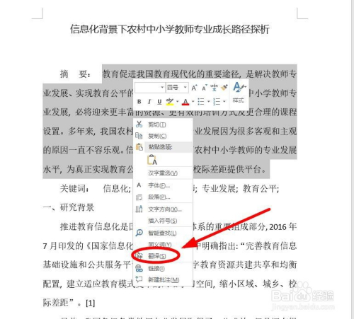 若是不需要把全文翻译,只是翻译一部门文档,可以选中要翻译的文档后,利用鼠标右键,单击“翻译”选项