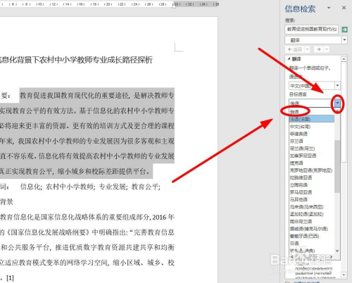 在窗口右边会弹出一个“信息检索”小窗口,在这里我们可以按照本身的需求,进行翻译设置