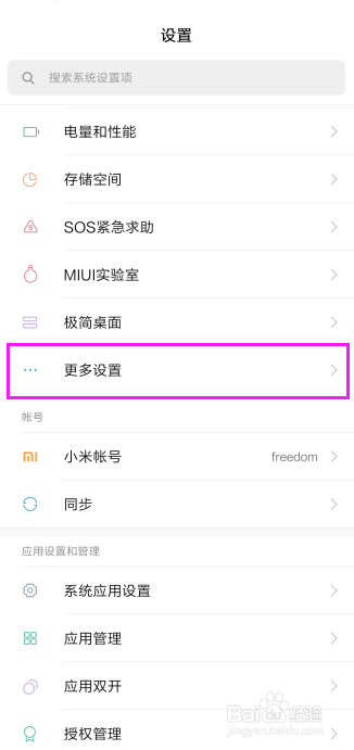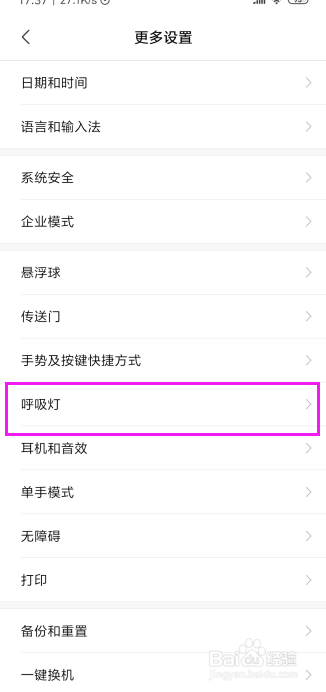 在更多设置的界面,找到呼吸灯的选项,如图所示