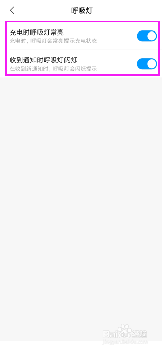来到呼吸灯的页面,你可以设置充电时呼吸灯常亮,还可以设置收到动静时呼吸灯闪灼,如图所示