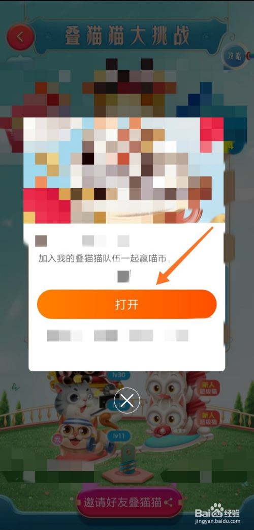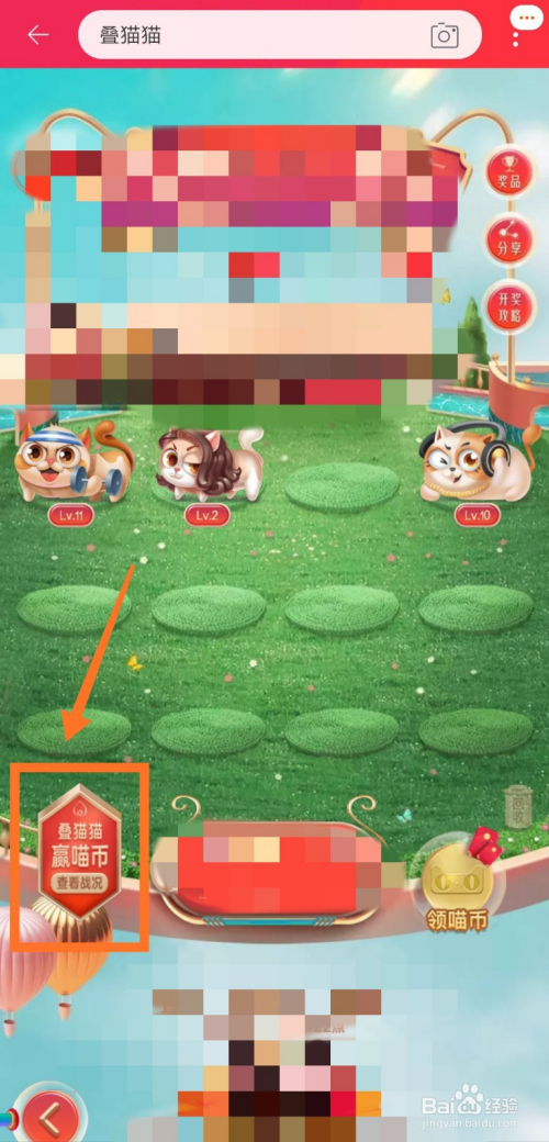 活动界面如下图所示,可以看到本身的猫品级。点击箭头处“叠猫猫赢瞄币 查看战况”。