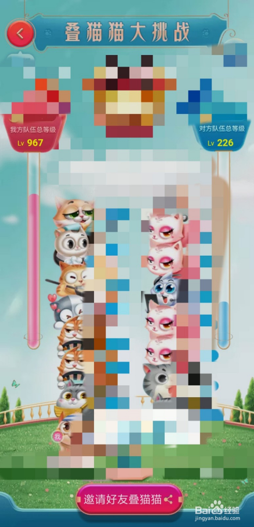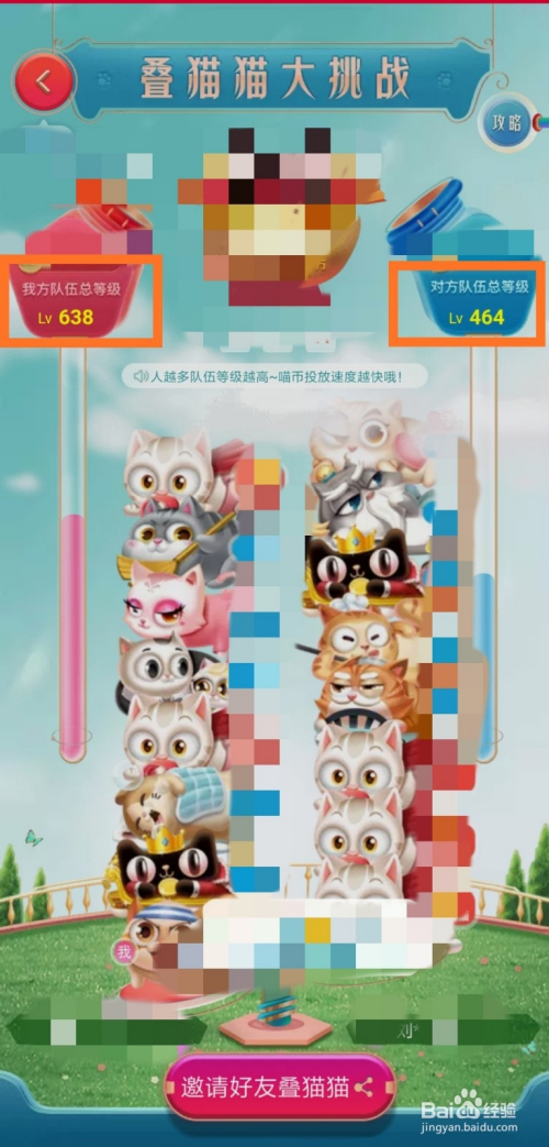 叠猫猫大挑战界面如下图所示,可以看到“我方步队总品级”以及“对方步队总品级”,品级越高瓜分奖励越多,若是感觉当前步队品级不敷高,可以退出当前步队,改换步队。