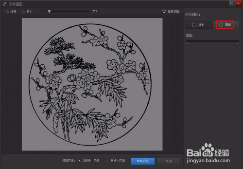 第四步:在外形抠图界面,单击切换至圆形,将圆形调整至与图片要抠取的区域等大,单击“替代布景”按钮。