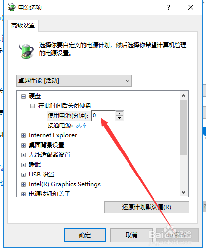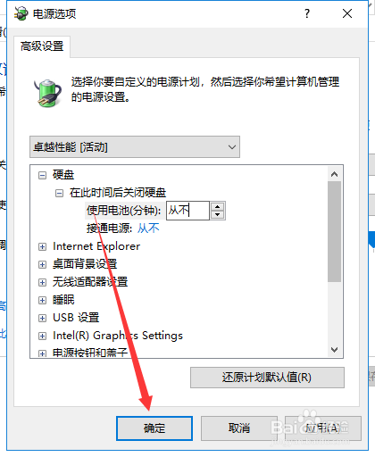 打开电源选项对话框中找到硬盘的在此时候后封闭硬盘的选项下的两个选项中都改为从不。