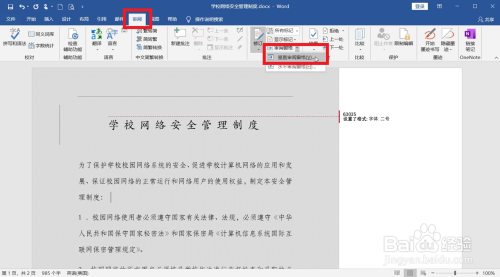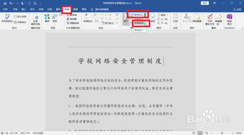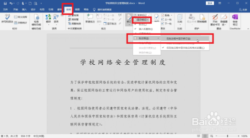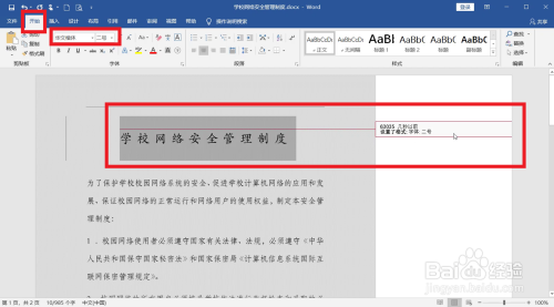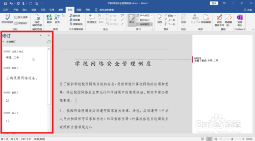 6、将文档的题目“校园收集平安办理轨制”的字号调整为“二号”,随即在右侧弹出一个批注框,并显示格局点窜的具体信息。