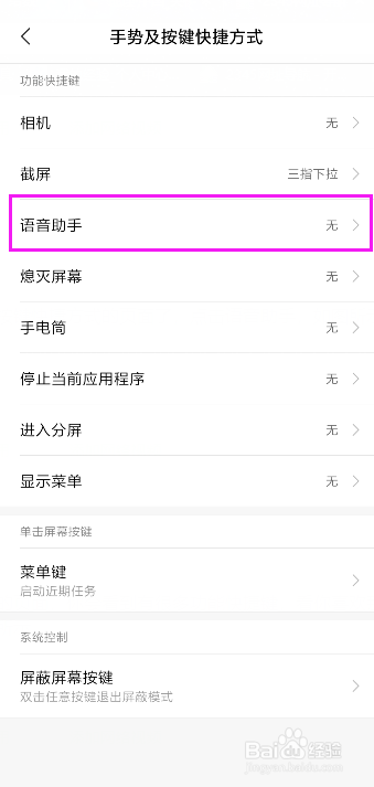 就来到手势及按键快捷体例的页面了,点击语音助手,如图所示