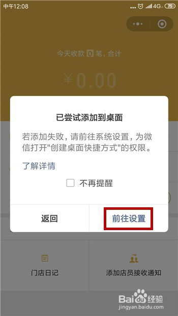 在添加的时辰若是呈现已测验考试添加到桌面的提醒时,申明权限未开启,点击【去设置】。