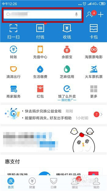 打开支付宝,在支付宝的首页里点击顶部的【搜刮栏】,如图所示。