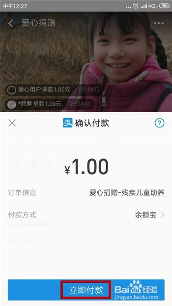 接下来点击【当即付条目】,然后输入支付宝密码后即可起头公益捐赠。
