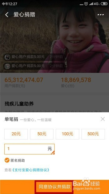 然后需要选择捐赠的金额,也可以自界说捐赠金额,设置好后点击【赞成和谈并捐赠】。