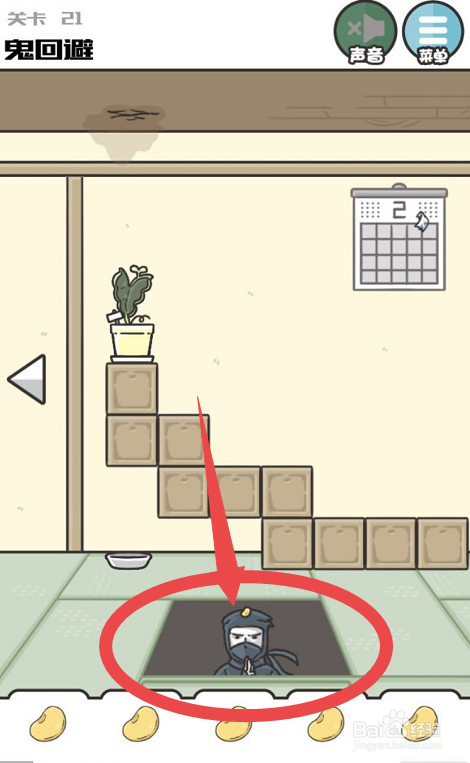 还有最后一个黄色的豆子,点击下图所示的位置的地面,然后地板会移开,移开之后可以发现下面有一个忍者,而且忍者的头上有一个黄色的豆子,点击就可以将所有的豆子就收集全了。