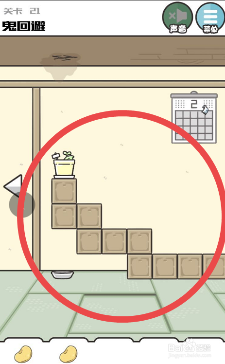 进入到第二十一关的具体挑战页面之后,可以看见今朝游戏人物正处于一间房子内,手里拿着一个盒子,看起来是要装豆子的。首先点击下图所示的两处位置的黄色豆子,收成两只豆子。