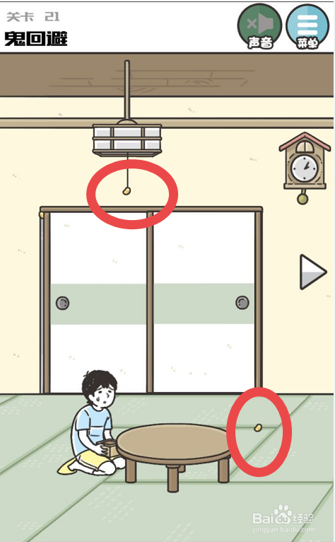 点击神回避3手游中的第二十一关起头第二十一关的挑战。神回避3手游第二十一关的挑战本家儿题是鬼回避,也就是要想法子阻止鬼才可以,而阻止鬼的最好的法子就是利用黄色的豆子
