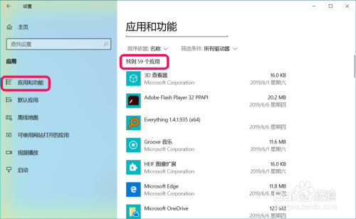 Windows 10系统中,在Windows 设置 - 应用和功能窗口中,可以看到:找到59个应用;