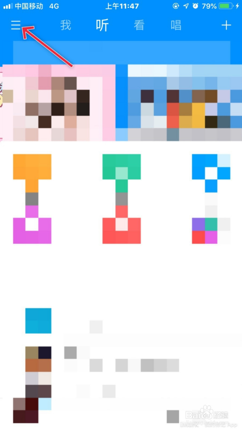 打开酷狗软件,进入酷狗本家儿界面,然后点击左上角的多功能列表