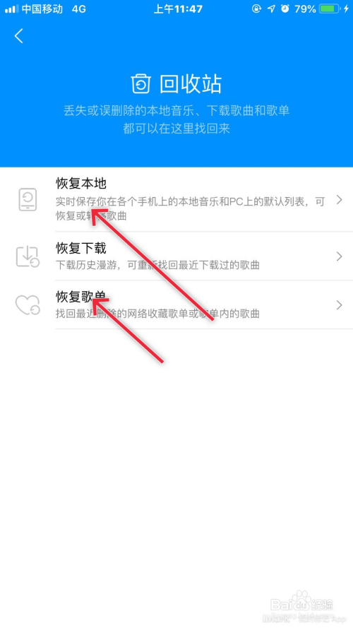 这里有【恢复当地】、【恢复下载】、【恢复歌单】三个选项