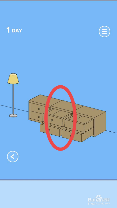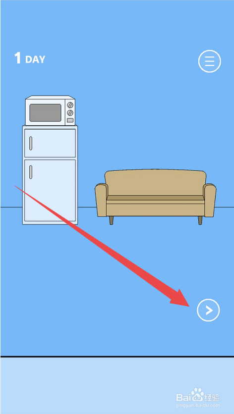 在第一天的具体的挑战页面内,可以看见这一页面内有一个长沙发,有一个冰箱,可是这些对于这一天的挑战没有什么帮忙,点击页面右侧的箭头,显示右侧的页面。