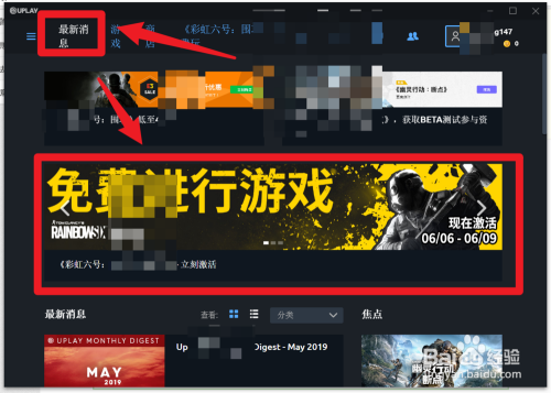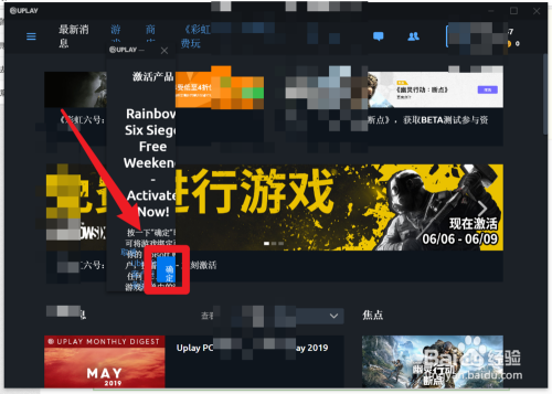 第二步,进入upla y之后,点击最新动静,接着找到彩虹六号的本家儿题页面并点击激励激活,如图所示。