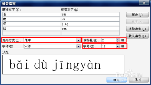 在“拼音指南”对话框中,可以对拼音的位置、大小、字体等进行调整,我将对齐体例改为居中,偏移量改为2磅,字号改为12磅,最后单击【确定】按钮。