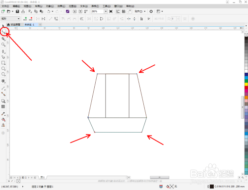 首先,点击【矩形东西】,按图示绘制三个矩形图案。选中图示两个矩形,点击鼠标右键-【转化为曲线】将图案转曲。完当作后,对矩形图案上的节点位置进行调整(如图所示);
