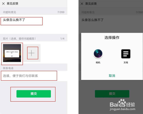 接着输入本身问题如”头像怎么换不了“后,添加本身呈现换头像呈现问题图片,输入联系体例后,再”提交“期待客服答复
