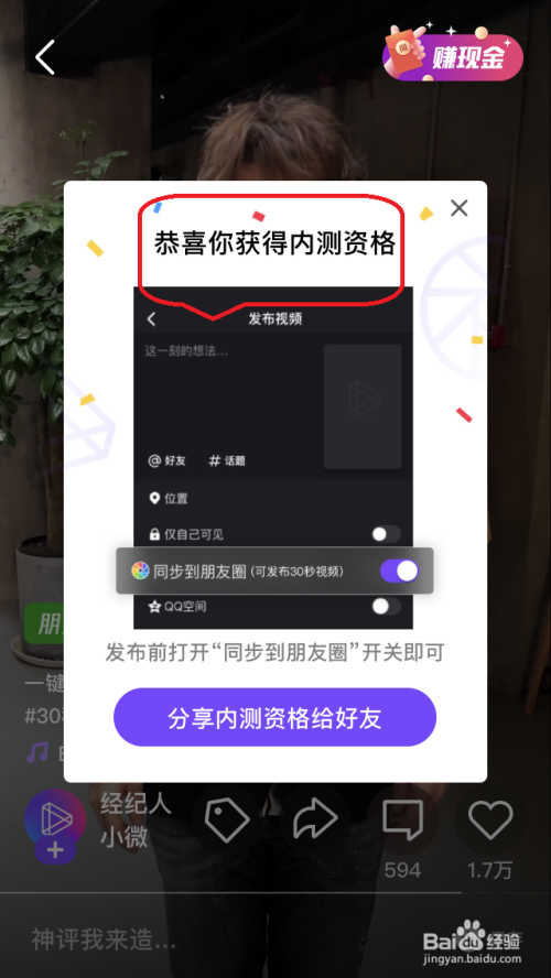点击当即获得“30s内测资格”,即可获得30s朋友圈内测资格。只需在微视中发布30s视频,打开“同步朋友圈”开关即可。