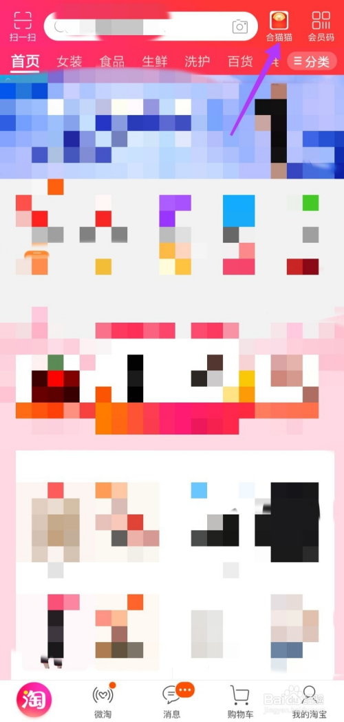 首先打开“手机淘宝”app,本家儿界面如下图所示,点击箭头处的“合猫猫”。