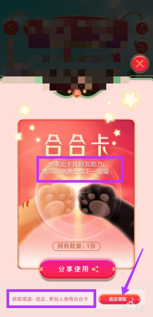 分享合合卡给老友,助力当作功后可以快速合当作下一级猫,合合卡的获取渠道有:进店、帮别人利用合合卡。点击箭头处“进店领取”。