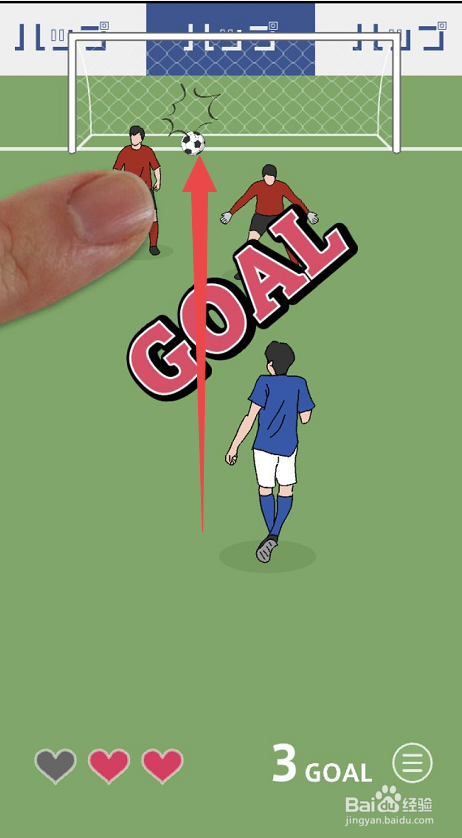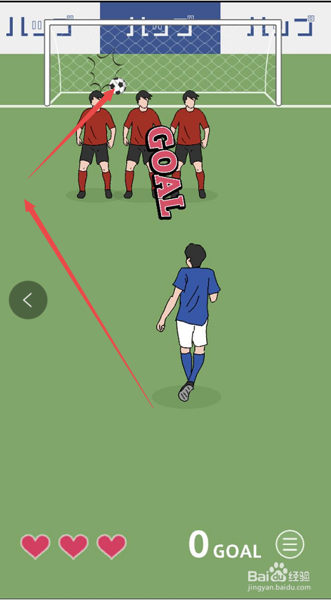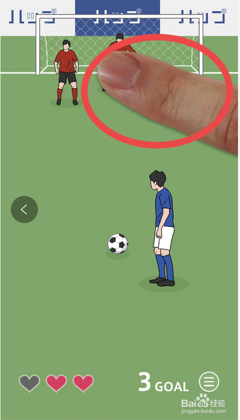 鄙人一末节内,可以看见再页面中会呈现一只手 ,这只手会将页面中球门前面的守门员的位置进行移动,细心不雅察之后就会发此刻手指移动守门员的时辰会呈现良多的空地,可以将足球射进球门内。