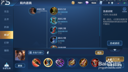 随后我们就可以出一件攻速鞋,增添移速的同时可以增添我们宫本武藏的进犯速度。