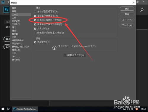 这样设置后,PS再次打开文档就会以窗口模式打开了