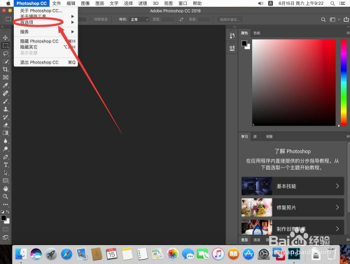 打开PS后,点击屏幕左上角苹果标记右侧的“Photoshop CC”
