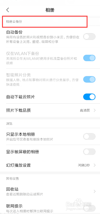 来到设置的页面,你会看到有个相册云备份,如图所示