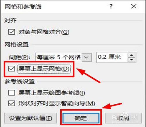 也可以点击【显示】选项组右下角的对话框启动器,在弹出的对话框中勾选【在屏幕上显示网格】,然后点击【确定】。