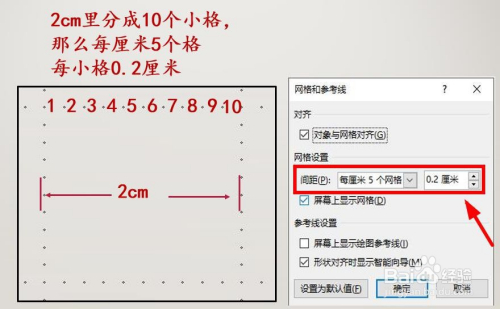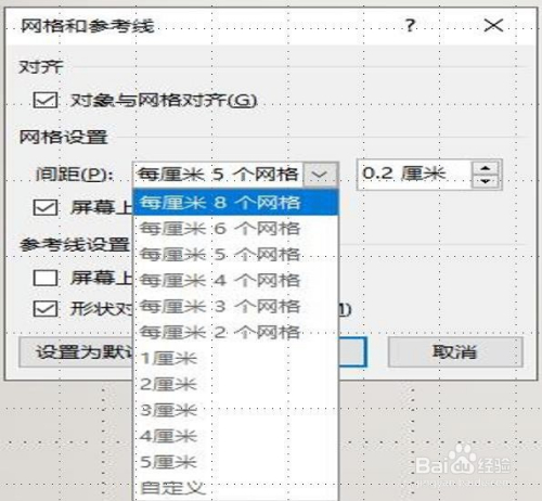 我们还可以在适才的对话框中调整网格线的间距。系统默认的是【每厘米5个网格】,每个网格0.2厘米,若是想要更切确,可以调整为【每厘米8个网格】,也可以在【自界说】那边本身设置。