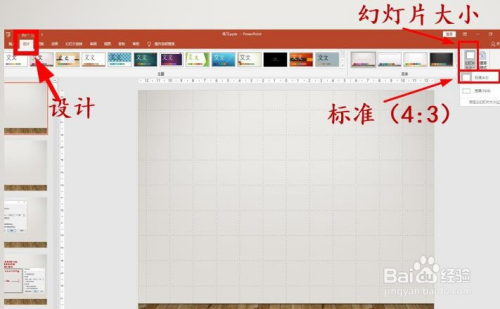 那么【每厘米5个网格】是什么意思嘞?这与幻灯片的大小有关。点击【设计】选项卡,在【幻灯片的大小】这里来看一下我的幻灯片的大小。此刻我的幻灯片是【尺度(4:3)】