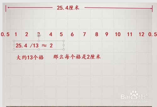 添加上网格线之后,来数一下,自左标的目的右一共大约13个大格子,也就是25.4厘米分当作大约13个格子,那么25.4 cm 除以13,大约等于2,也就是说每个格子的宽度是2厘米。