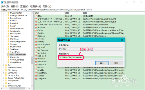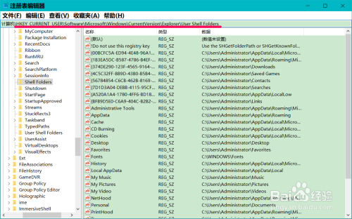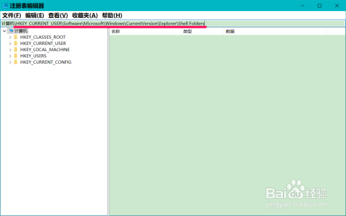 再复制:\HKEY_CURRENT_USER\Software\Microsoft\Windows\CurrentVersion\Explorer\User Shell Folders注册表路径到注册表地址栏中;