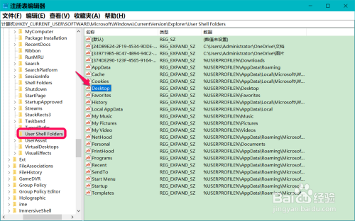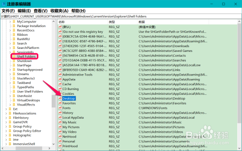 粘贴完当作后,我们按下键盘上的回车键,定位到User Shell Folders,在对应的右侧窗口中找到并左键双击:Desktop;
