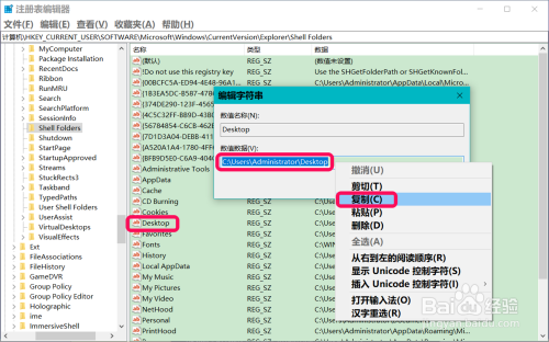在打开的编纂字符串对话框中,右键点击Desktop数值数据,在右键菜单中点击复制,将 C:\Users\Administrator\Desktop复制到记事本中;