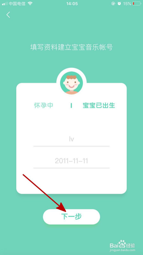 按照提醒输入宝宝名字和出生日期,点击下一步,如下图