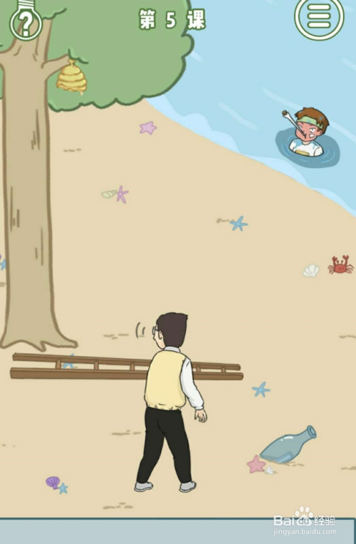首先第二关,我们可以看到沙岸上有一个水瓶,我们捡起来,然后拖沓水瓶到水池就可以获得装了水的瓶子