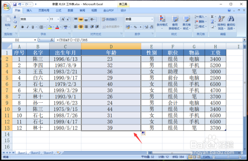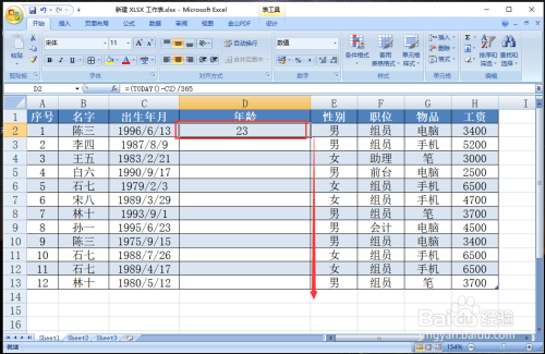 注重:若是你的表格“出生日期”是在其他列,好比:D列第3行,那么就把C2改当作D3,输入格局为“=(TODAY()-D3)/365"