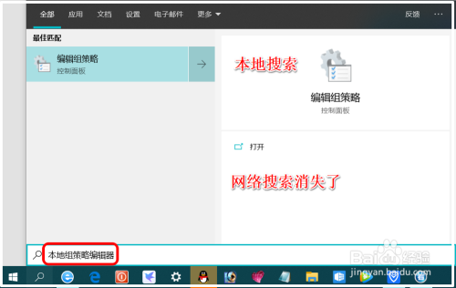 我们在Cortana搜索框中再输入当地组策略编纂器时,只进行了组策略的当地搜刮,联网搜刮成果 消逝了。