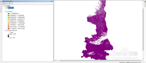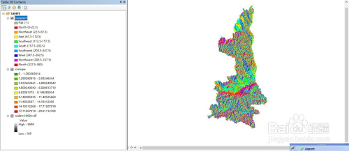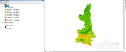 坡标的目的计较与上一步调近似,Input Raster(输入栅格)一栏,我们DEM数据添加进去,输出位置默认,输出成果如图所示,其主动分类为10个偏向