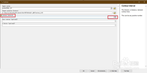 在等值线对话框中,Input Raster(输入栅格)一栏,我们把DEM数据添加进去,Contour Interval(等值线间距)一栏,我们按照本身需要设置距离,这里我设置的为100,Base contour(肇端等值线值)可以选择默认为0,也可以自行设置,输出位置我们选择默认,最终的等高线提取成果如图所示