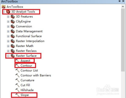 按照提醒,我们依次点击Spatial Analyst Tools(空间阐发东西)、Surface(概况),在打开的概况东西集中存在Aspect(坡标的目的)、contour(等值线)、slope(坡度)东西。或者,我们也可以利用3D Analyst Tools东西箱下的Raster surface(栅格概况)东西集,其下的坡度、坡标的目的和等值线东西也是可用的