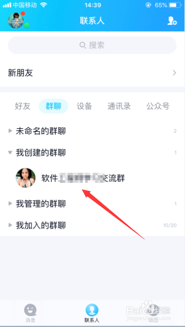 首先,打开并登录QQ之后,进入QQ的首页,选择“联系人->群聊->我建立的群”,并点击进入群聊,如图所示。