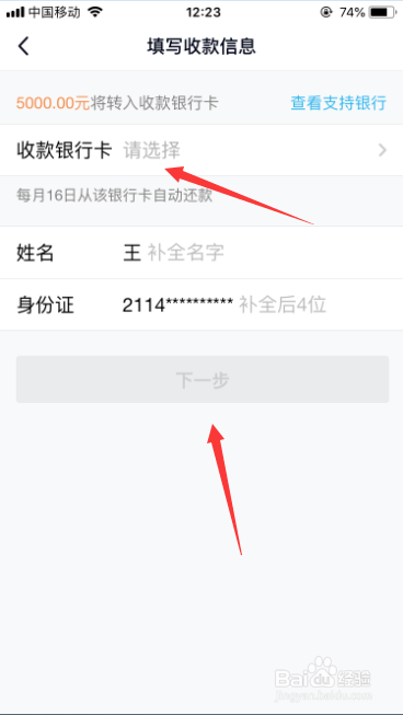 最后,选择收条目的银行卡,以及不全姓名和身份证号,信息无误后,审核经由过程就会把告贷打入该银行卡内,如图所示。